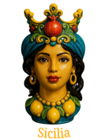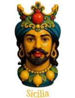 Da un lato, la grazia e la bellezza della fanciulla siciliana; dall'altro, il fascino fiero del giovane Moro. Entrambi sono adornati con i simboli della nostra terra: corone dorate, rossi melograni (simbolo di fertilità e fortuna) e i gialli limoni di Sicilia, che sembrano quasi sprigionare il loro profumo.